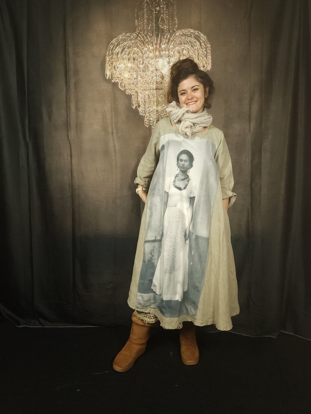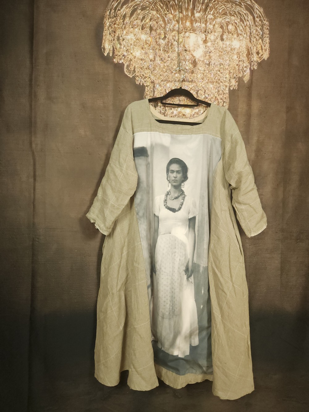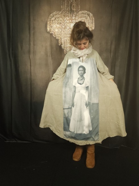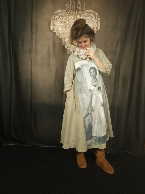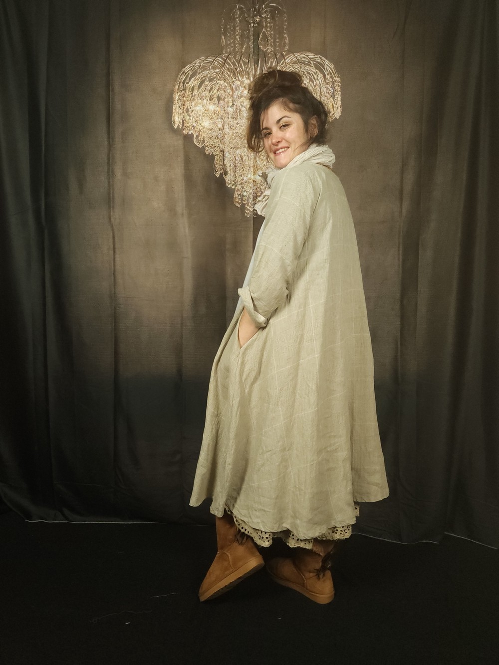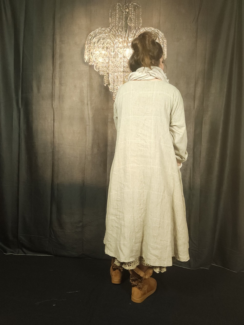 Très beau lin lavé au tissage "Prince de Galles" pour cette robe trapèze