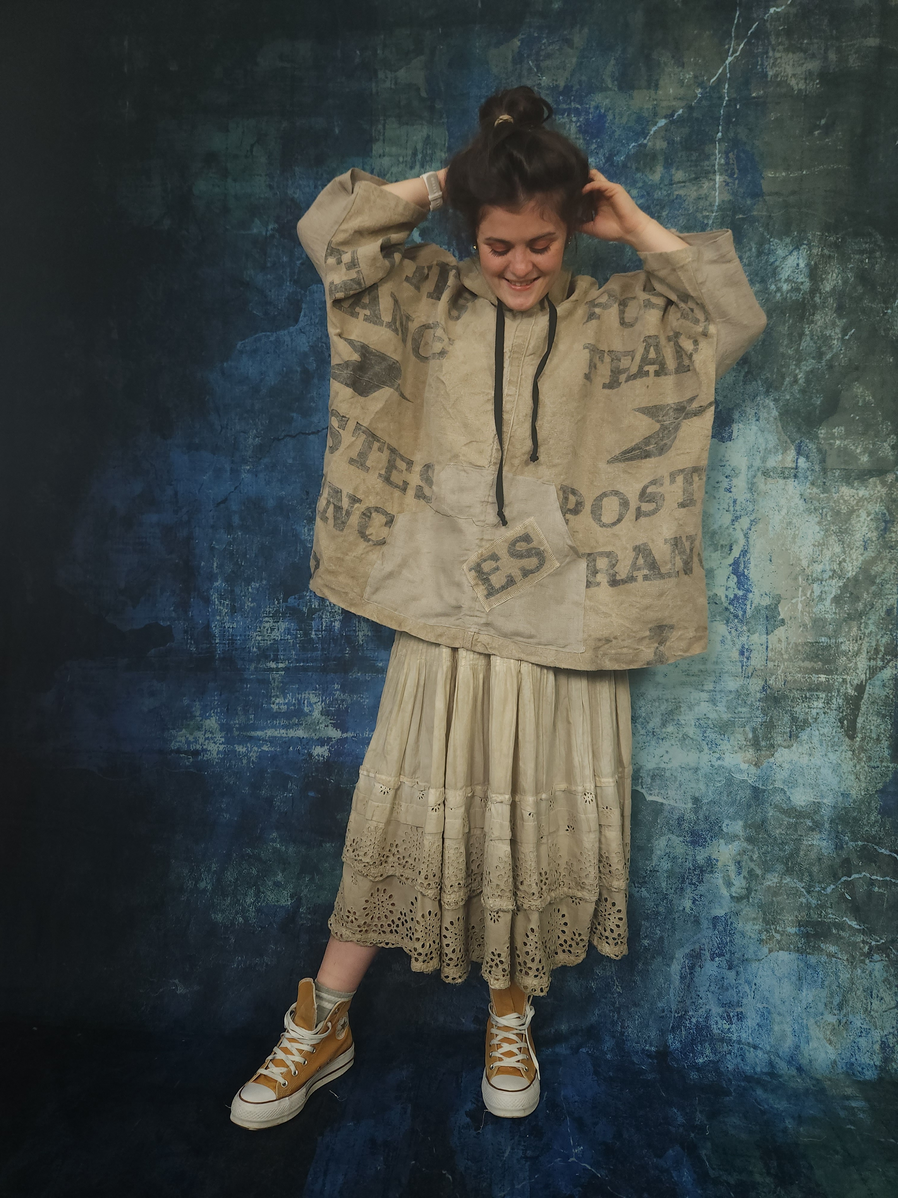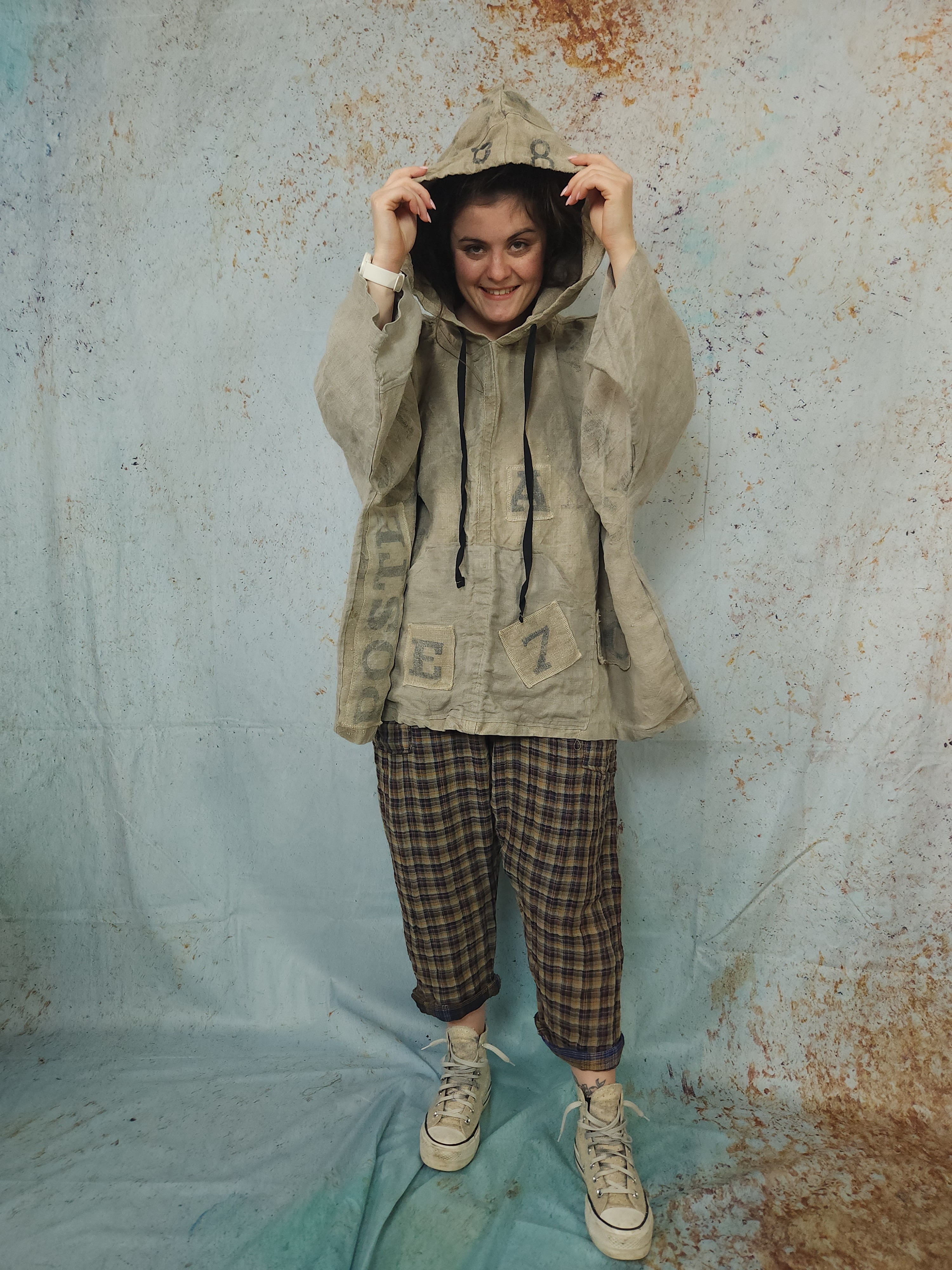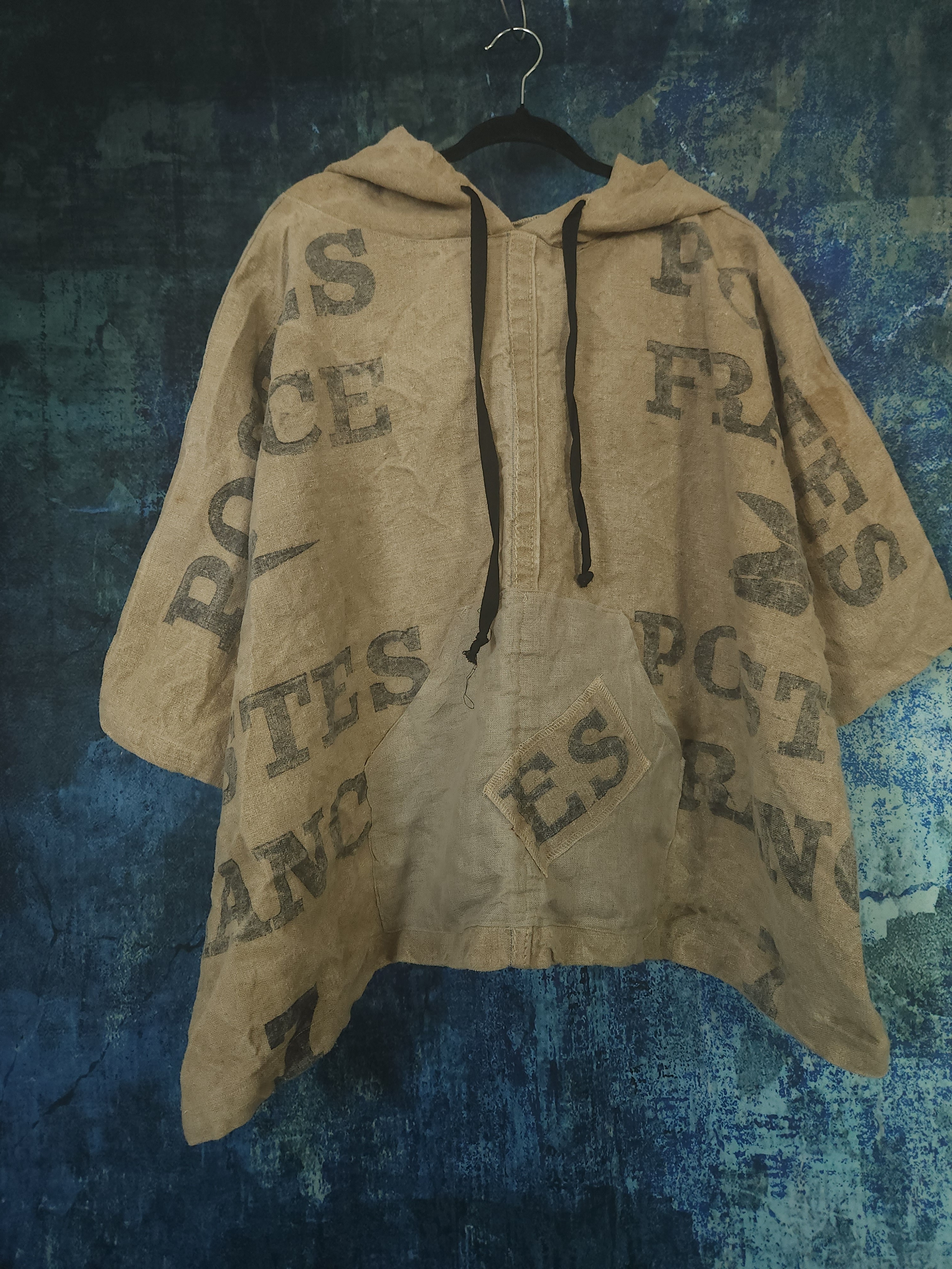 Vareuse à capuche réalisée dans un lin rustique d'ancien sac "La Poste" .