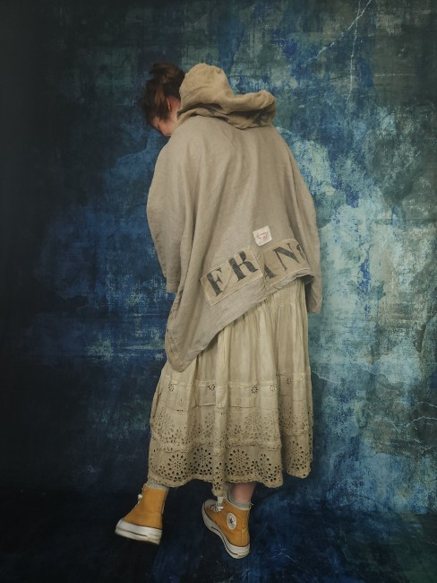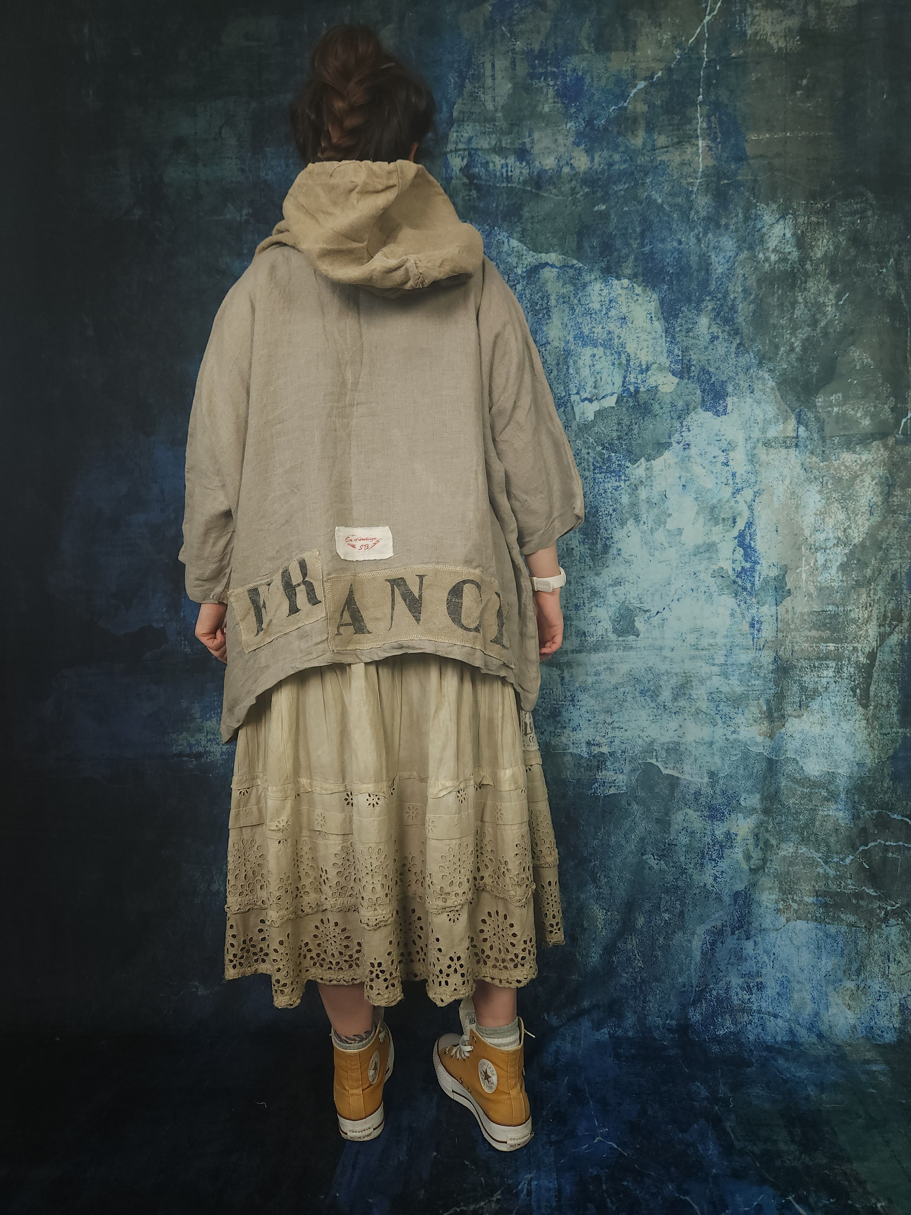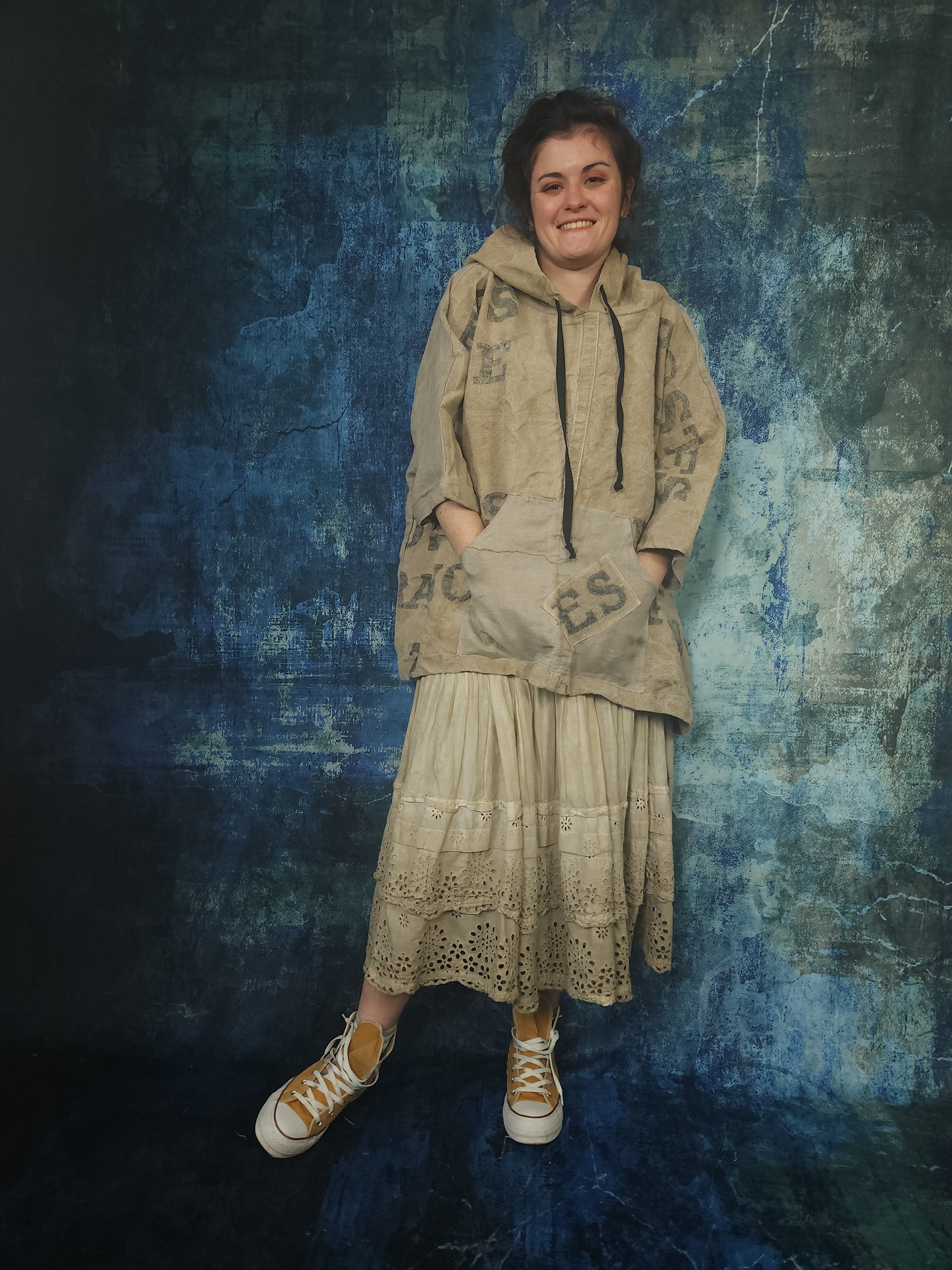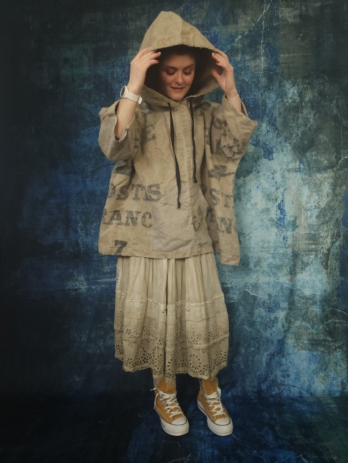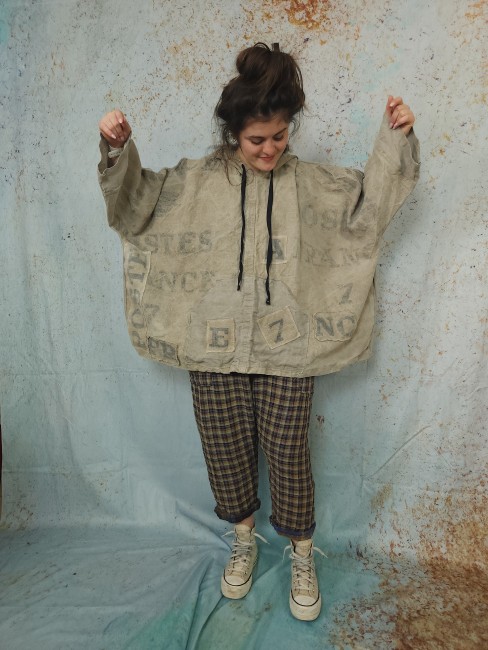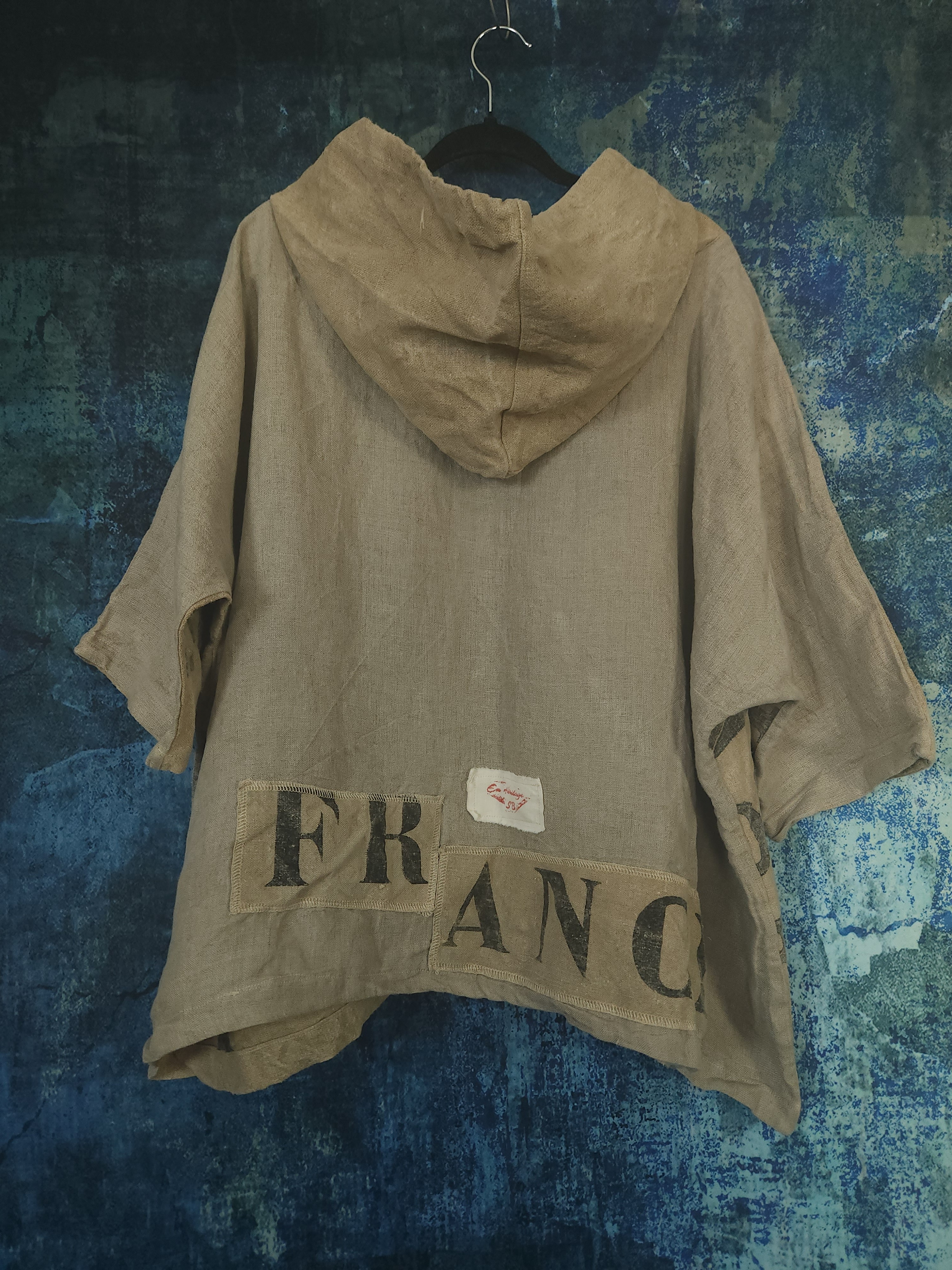 Vareuse à capuche réalisée dans un lin rustique d'ancien sac "La Poste" .