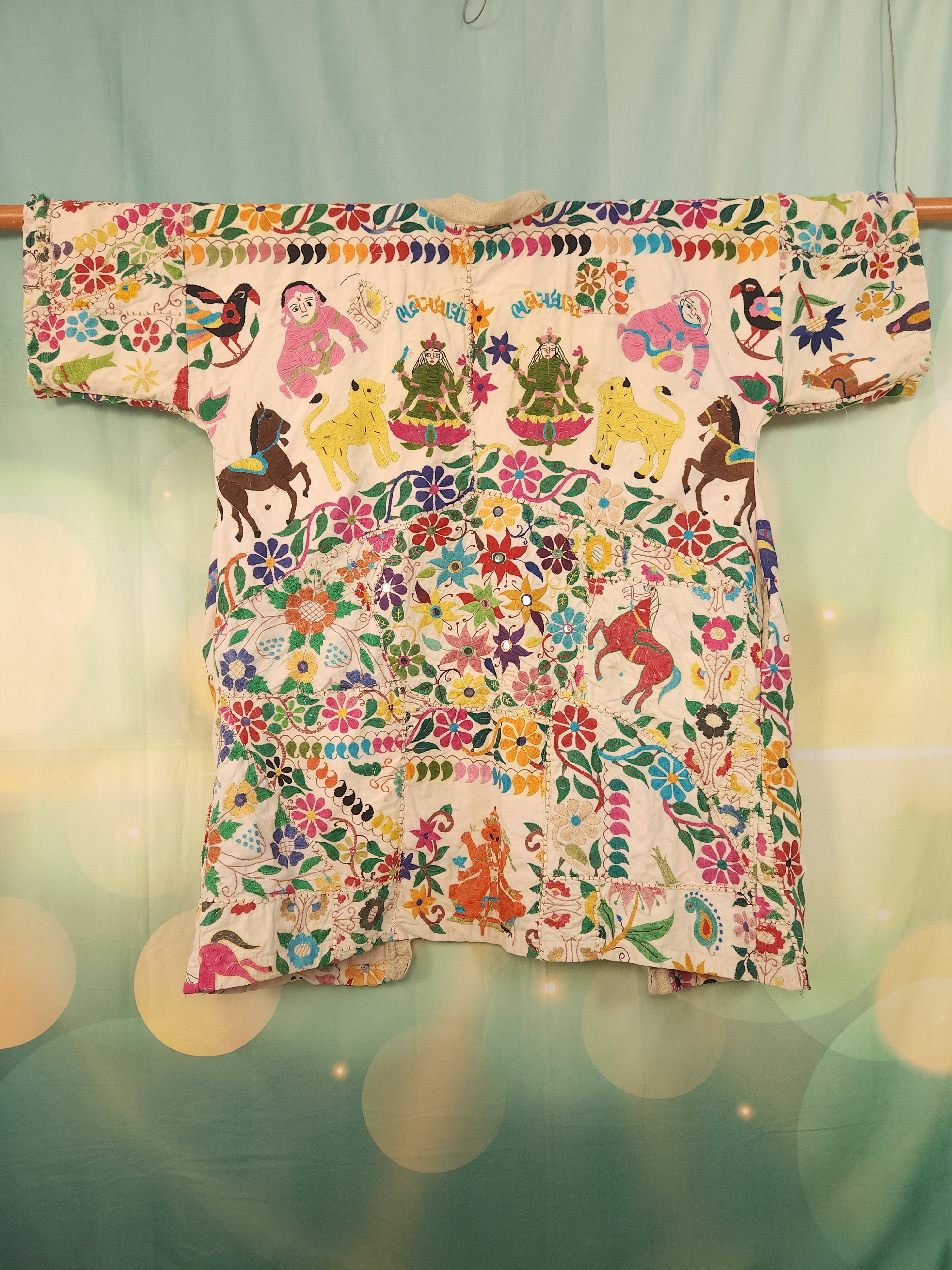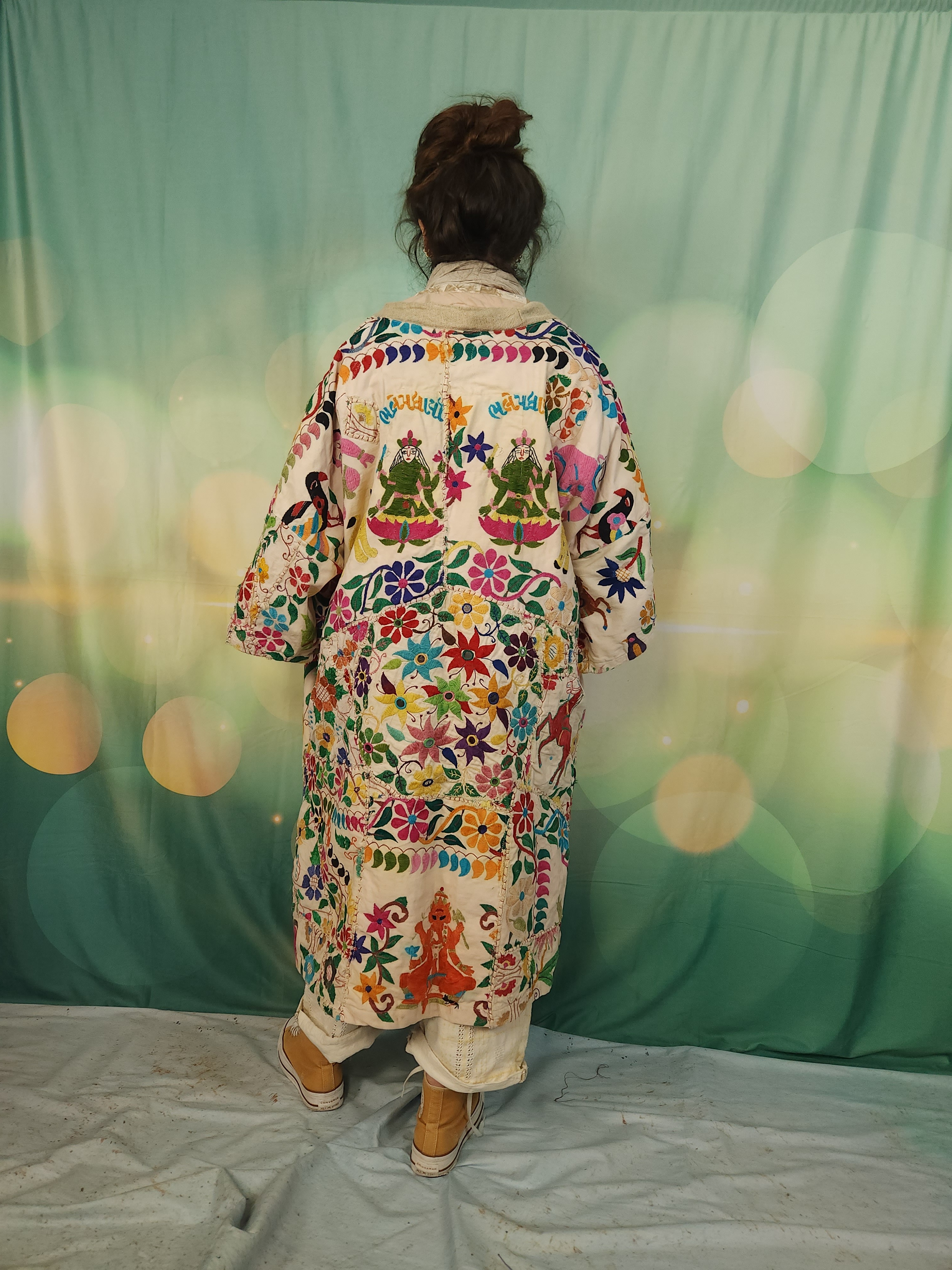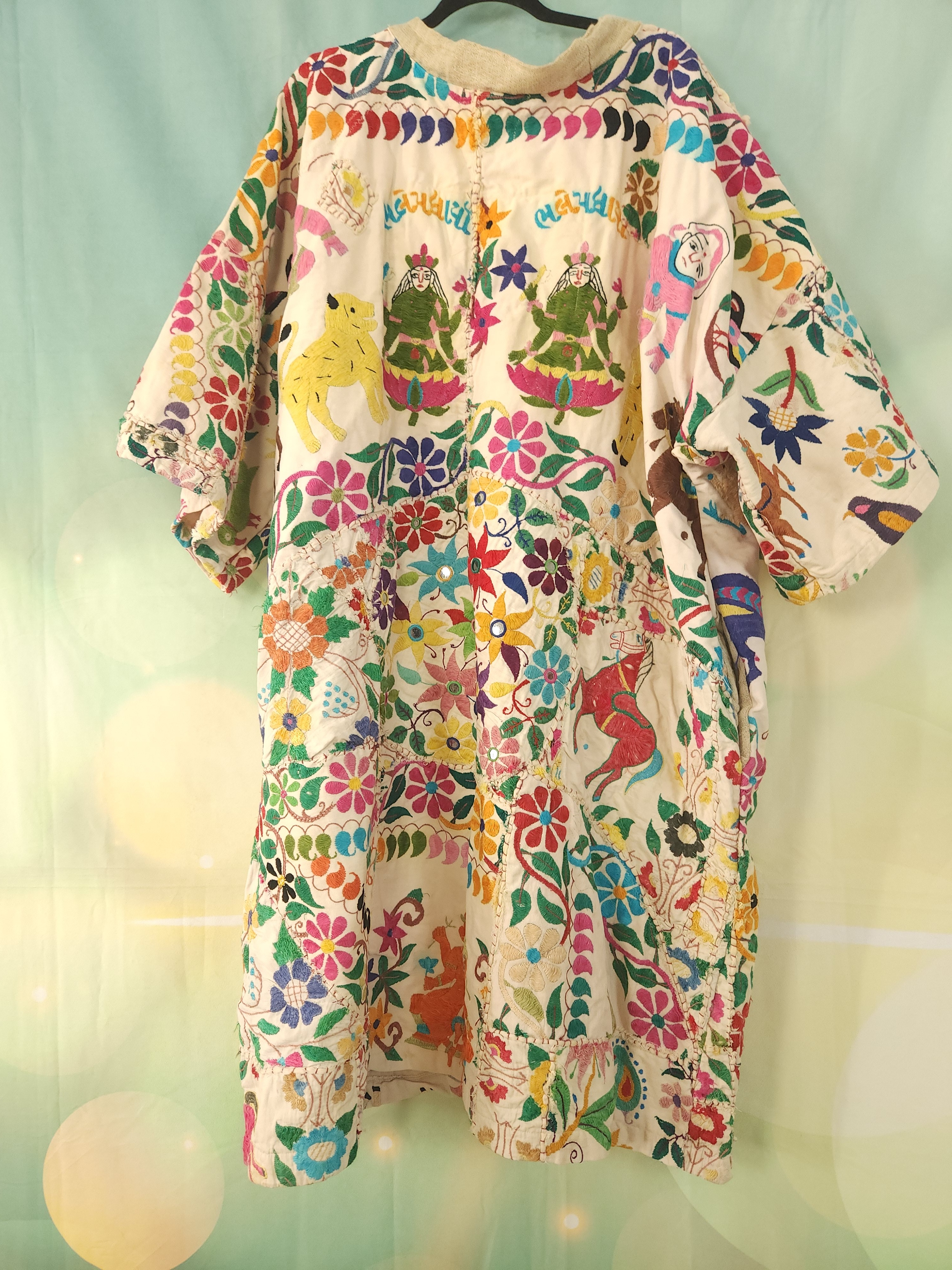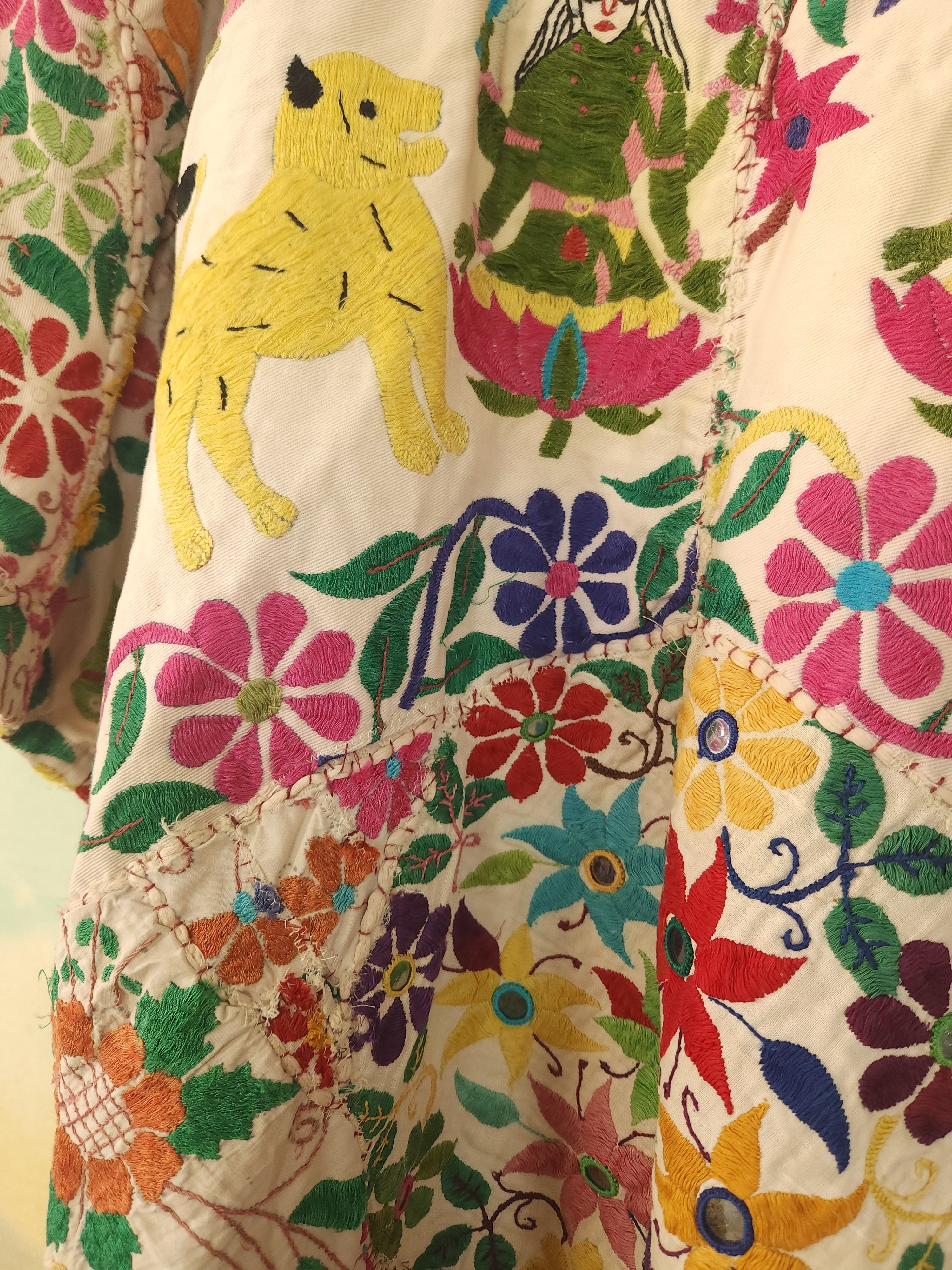 D'abord , une magnifique tenture indienne ancienne , en coton épais , remplie de broderies ,toutes réalisées à la main.
