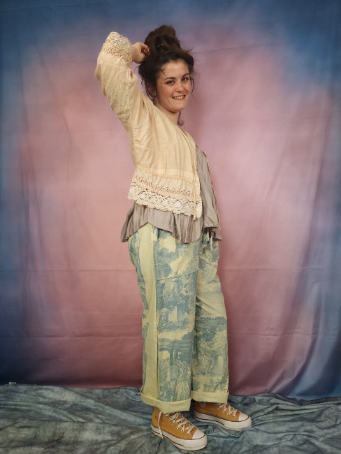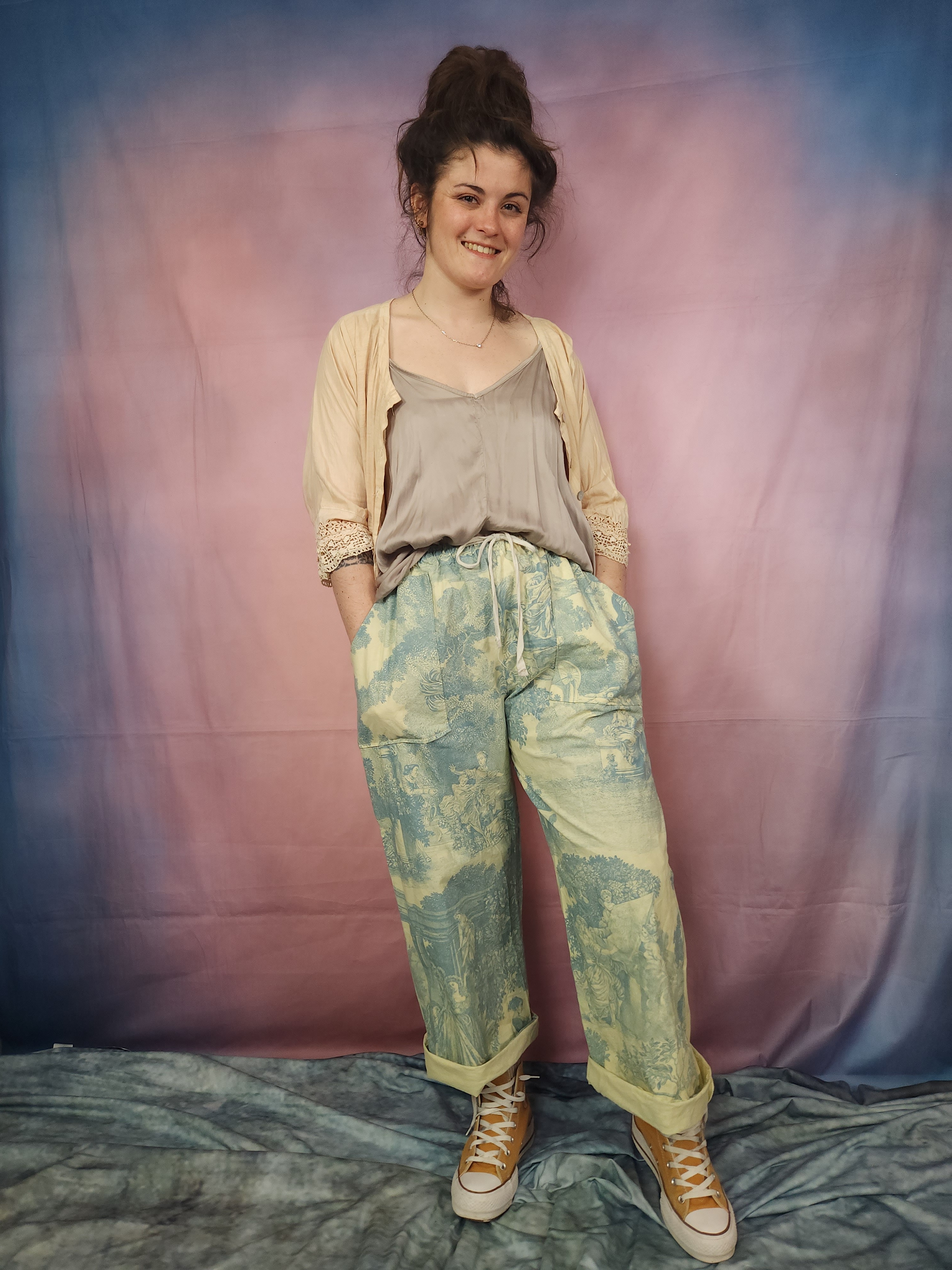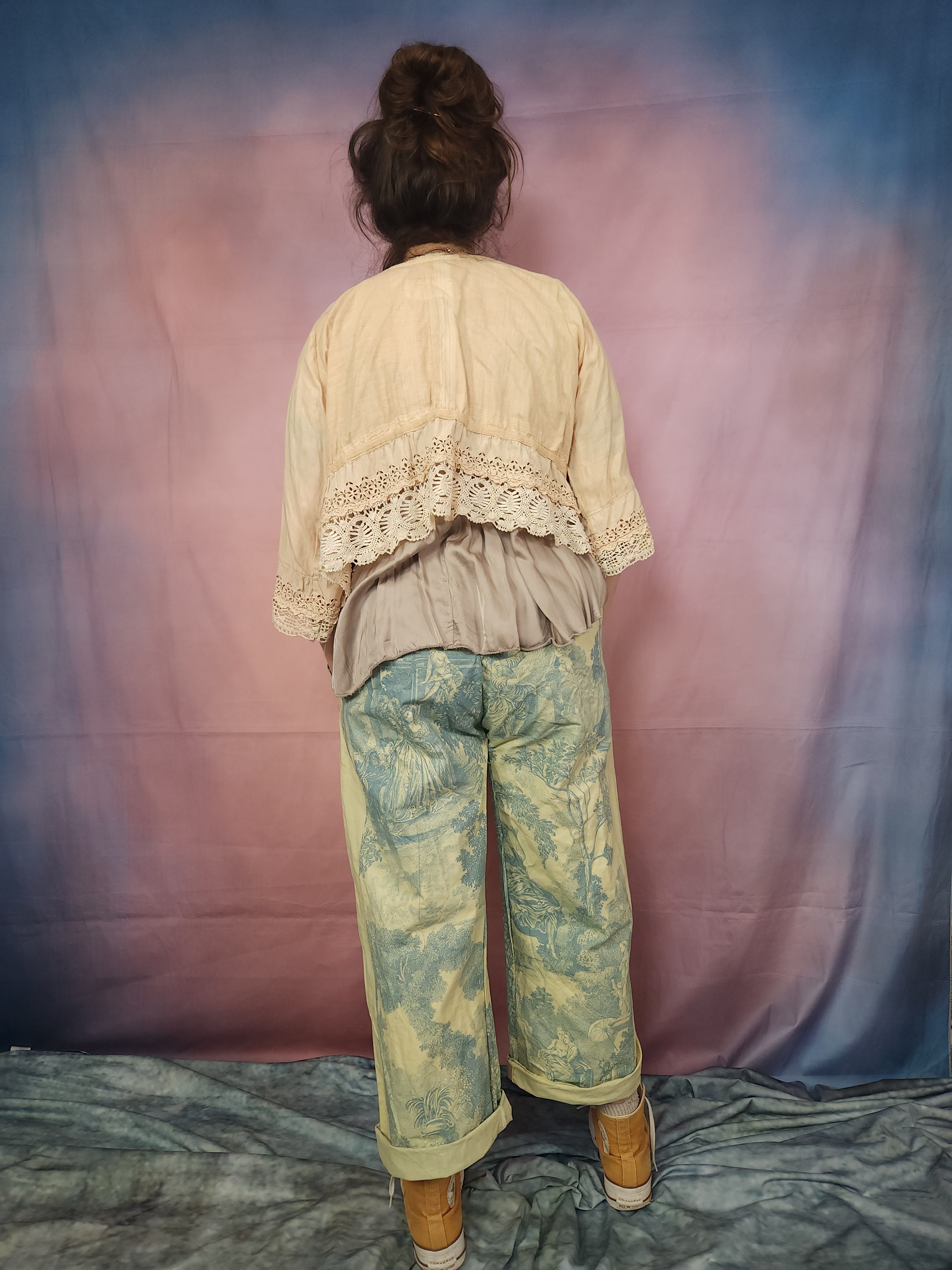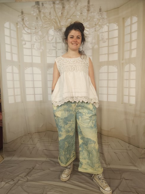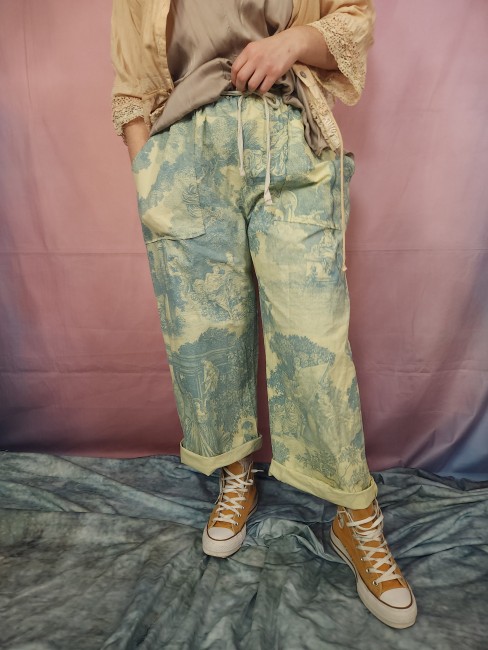 Pièce unique pour ce panta réalisé dans une belle toile de Jouy ancienne.